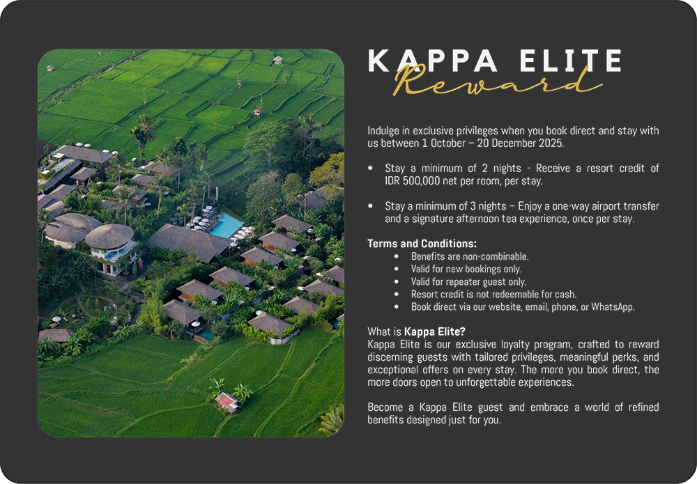 Au Kappa Senses Ubud, vivez des instants divins au pays des Dieux, dans un cadre haut de gamme responsable �cologiquement et socialement. Rejoignez une des �les les plus convoit�es de la plan�te et plongez au coeur des rizi�res, dont le charme et la beaut� vous surprendront jour apr�s jour. Plongez dans l'univers romantique de Rama et Shinta, les Rom�o et Juliette balinais. Que vous soyez en qu�te d'un endroit pour vous connecter � quelque chose de plus grand que vous en toute s�r�nit�, ou dun refuge au sein d'une jungle luxuriante, arrivez avec un cœur ouvert et repartez chang� � jamais gr�ce � une destination et des exp�riences qui ont du sens.