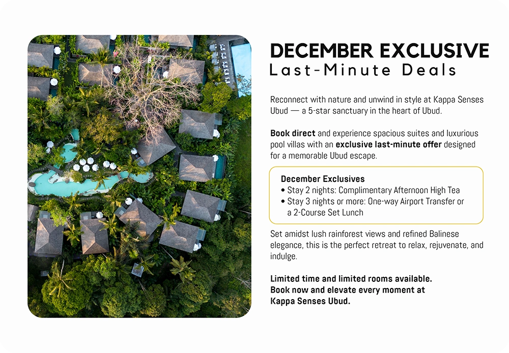 As 2025 draws to a close, allow yourself to be swept into a world of wonder — where the emerald green of Ubud’s rice paddy fields meets the mystique of tropical jungle.